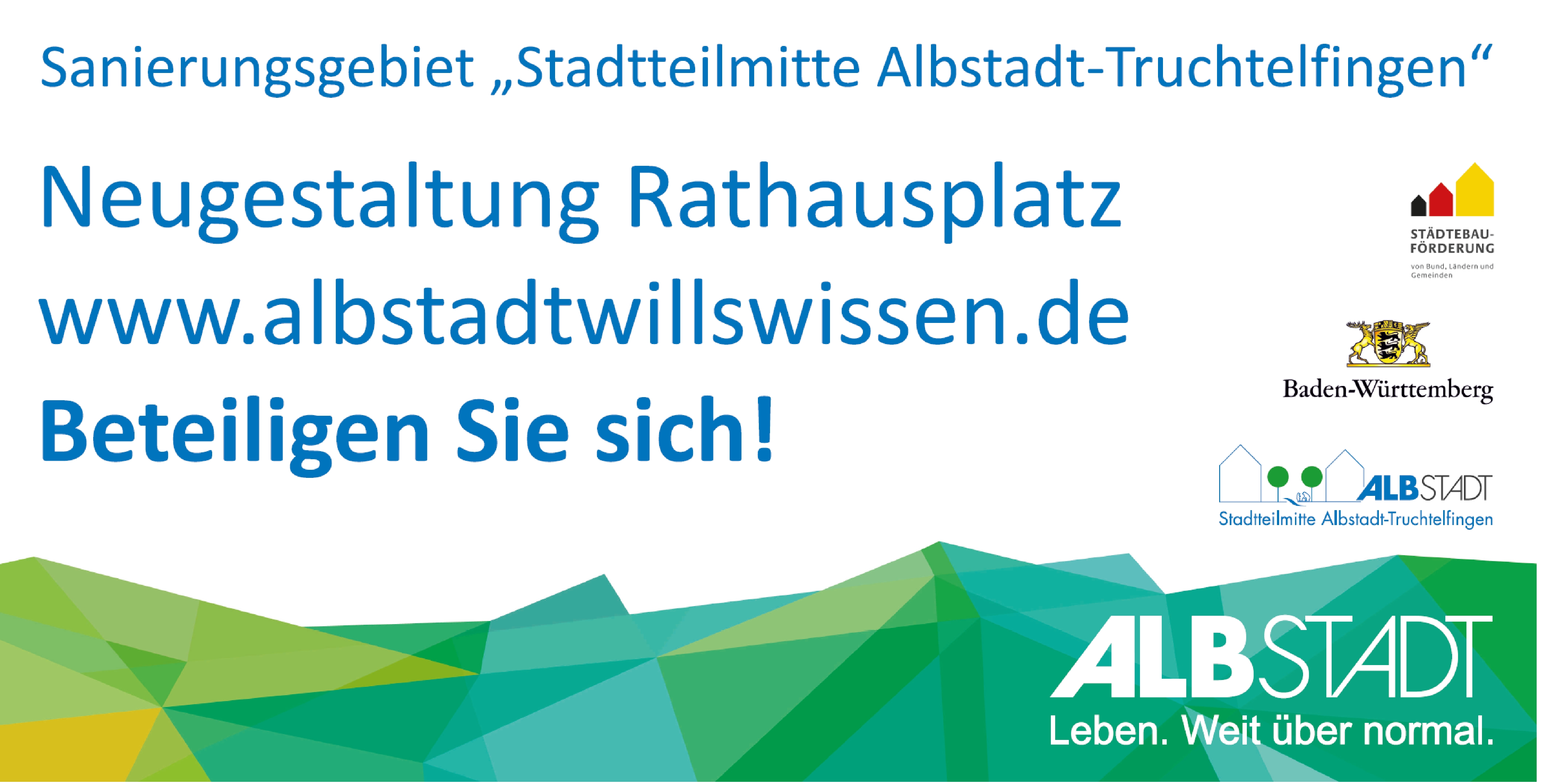 Herzlich willkommen und vielen Dank für ihr Interesse an den Planungen zur Neugestaltung des Rathausplatzes in Albstadt-Truchtelfingen im Rahmen des Sanierungsgebiets „Stadtteilmitte Albstadt-Truchtelfingen“.