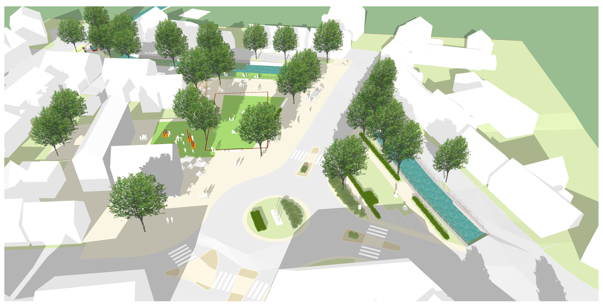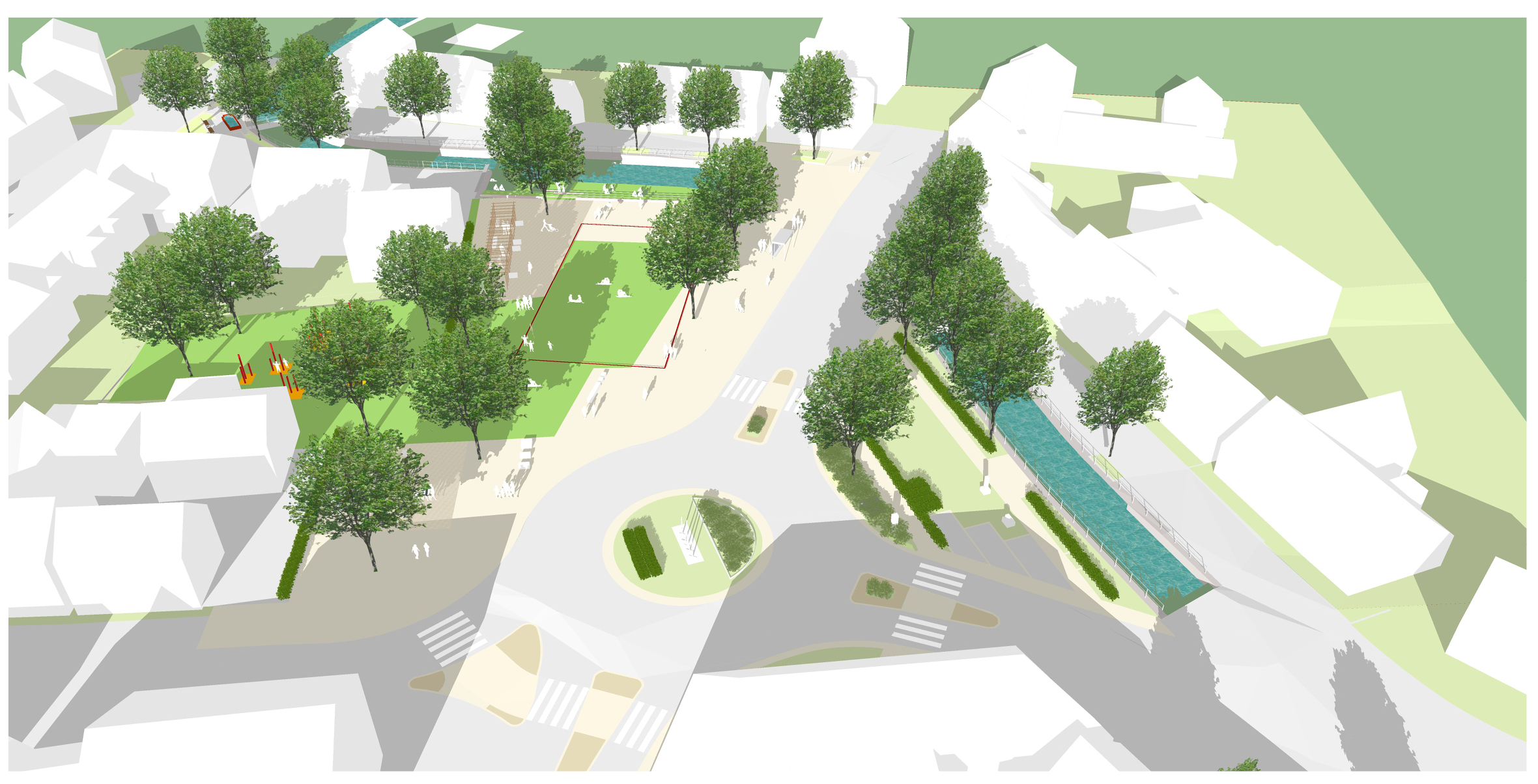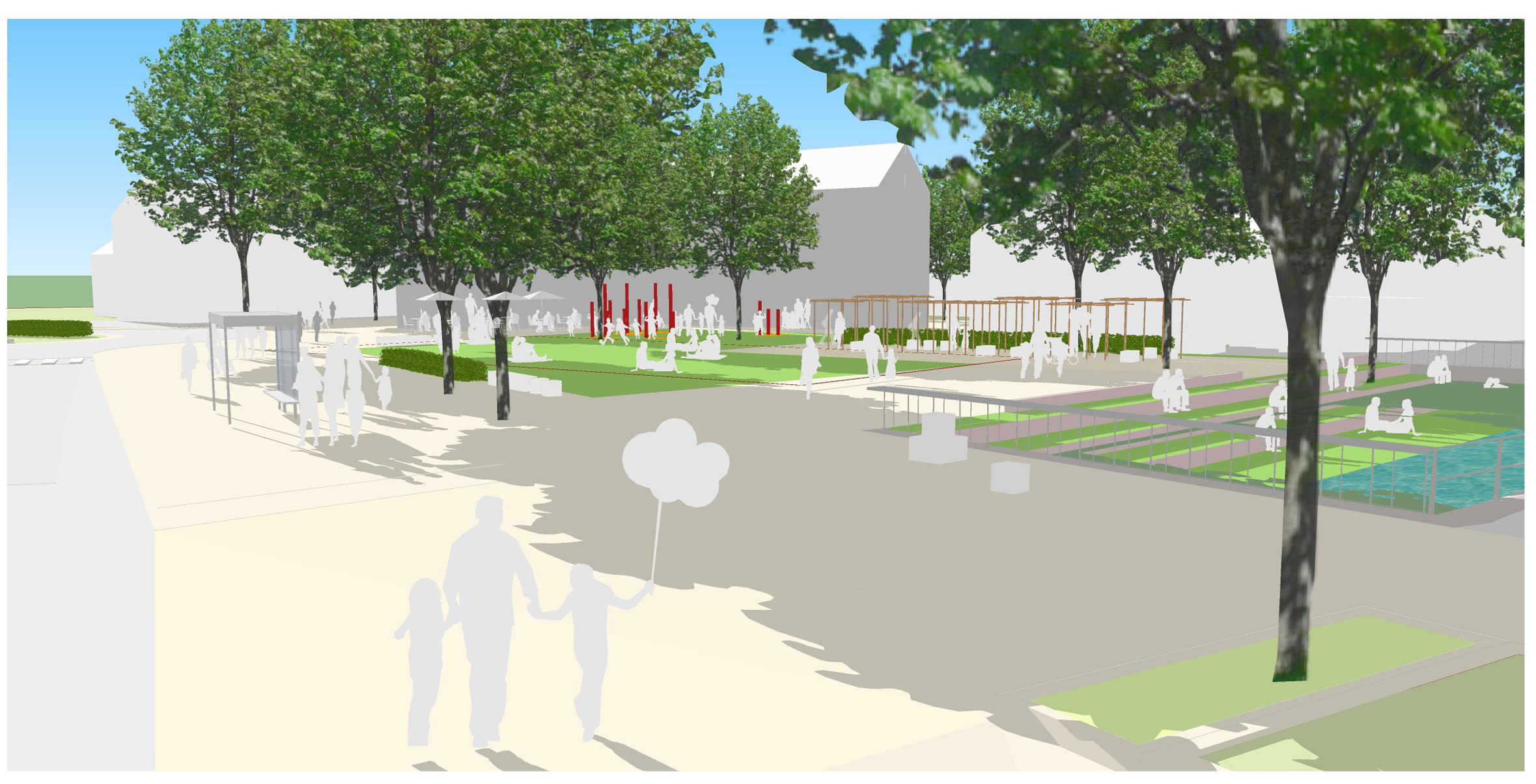 Nördlich der neuen Bebauung ist eine Spielfläche sowie ein Aufenthaltsbereich z.B. unter einer Pergola vorgesehen. Somit entsteht ein sehr attraktiverer Aufenthaltsbereich mit einem klaren Abstand zur stark befahrenen Konrad-Adenauer-Straße. Zur Schmiecha hin erfolgt der Rückbau der vorhandenen Ufermauer und eine Aufweitung der Fläche. Sitzstufe laden zum Aufenthalt am Wasser ein und machen die Schmiecha erlebbar. Durch die Aufweitung entsteht Rückhaltevolumen für Starkregenereignisse.