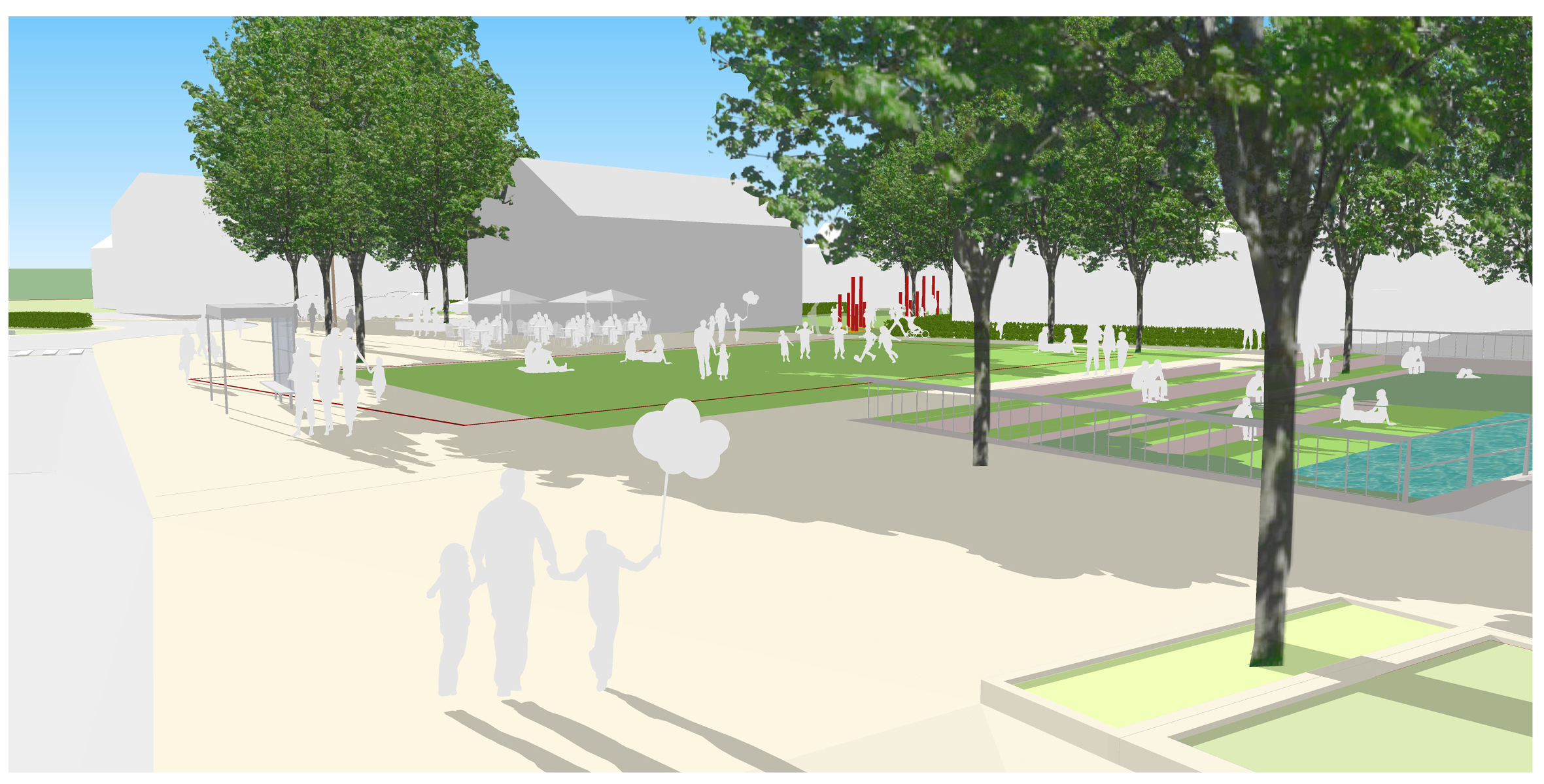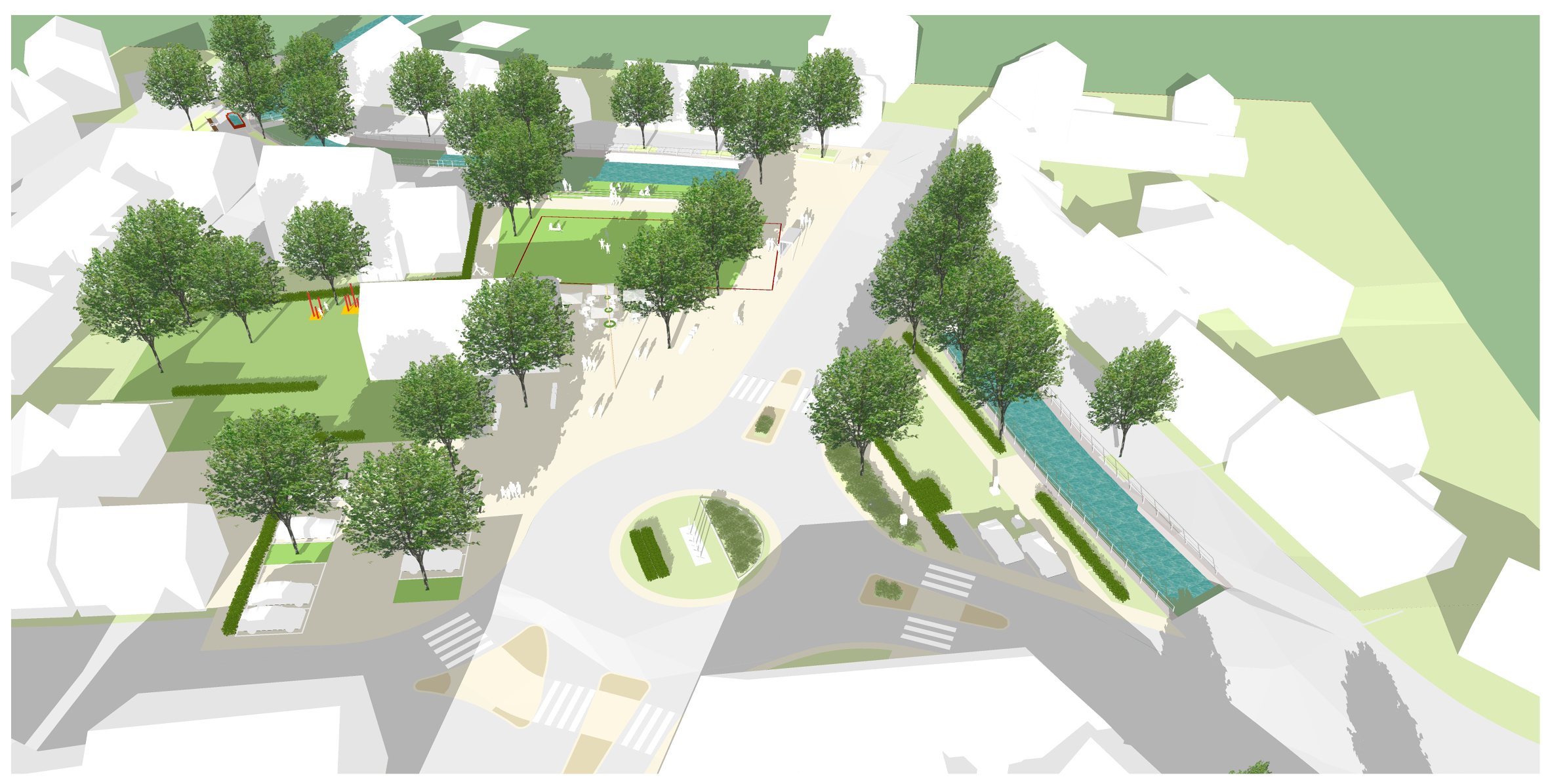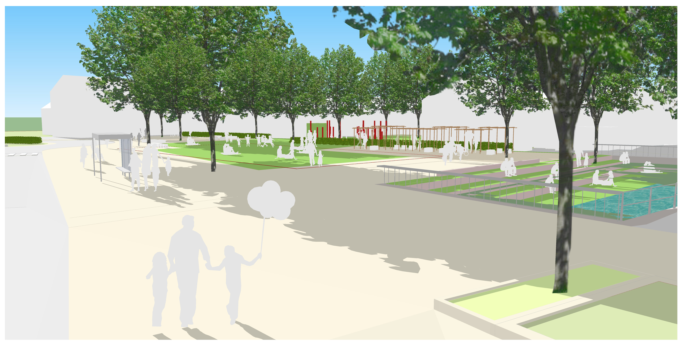 Nördlich der neuen Bebauung ist eine Spielfläche sowie ein Aufenthaltsbereich z.B. unter einer Pergola vorgesehen. Somit entsteht ein sehr attraktiverer Aufenthaltsbereich mit einem klaren Abstand zur stark befahrenen Konrad-Adenauer-Straße. Zur Schmiecha hin erfolgt der Rückbau der vorhandenen Ufermauer und eine Aufweitung der Fläche. Sitzstufe laden zum Aufenthalt am Wasser ein und machen die Schmiecha erlebbar. Durch die Aufweitung entsteht Rückhaltevolumen für Starkregenereignisse.