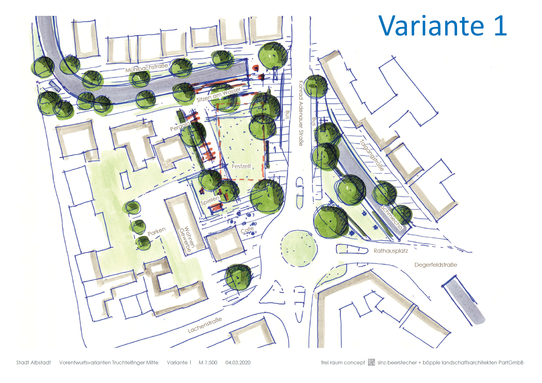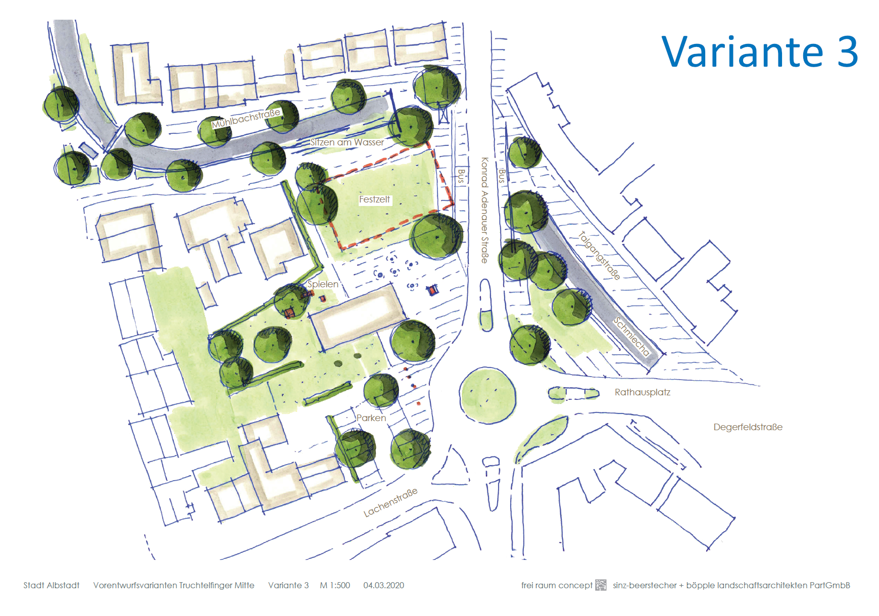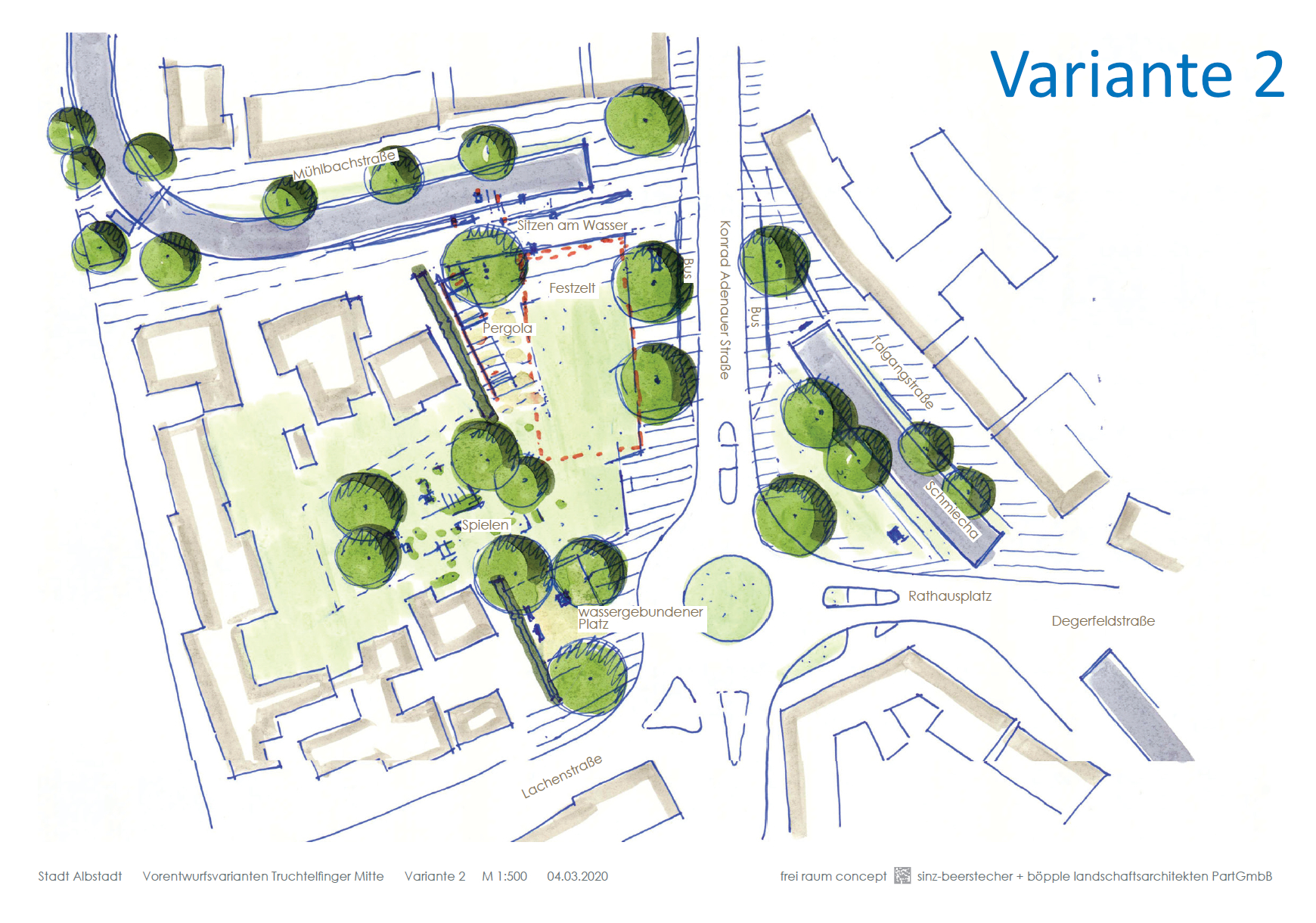 Bei der Variante 2 steht der Freiraum im Vordergrund, eine weitere Bebauung ist nicht vorgesehen. Westlich der Konrad-Adenauer-Straße entsteht eine großzügige Aufenthaltsfläche. Als Abgrenzung zur vorhandenen Bebauung sind Heckenriegel vorgesehen. Dazwischen öffnet sich die Rasenfläche und bietet Raum zum Spielen. Nach Süden, zur Lachenstraße hin ist ein wassergebundener Platz mit Bänken vorgesehen. Nördlich an den Spielplatz schließt eine Pergola an. Auch hier sind Sitzmöglichkeiten vorhanden. Zwischen Pergola und Bushaltestelle ist eine Rasenfläche geplant. Hier ist ausreichend Platz für das Festzelt.