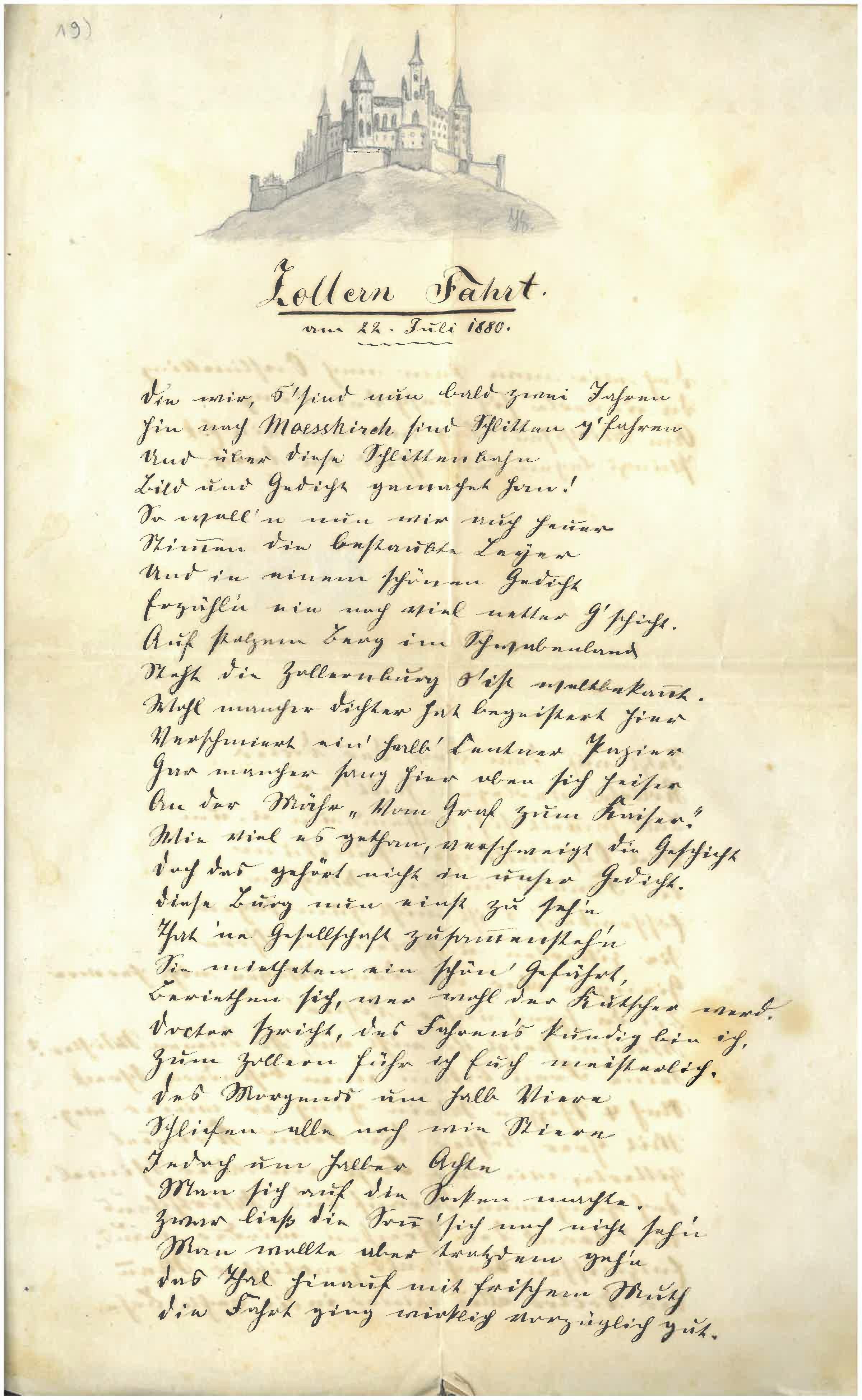 Inhaltlich wird in dem besagten „Zollern Fahrt“-Gedicht, das eine Reminiszenz an einen sommerlichen Ausflug vom 22. Juli 1880 darstellt, auf eine heitere Kutschfahrt durch den Talgang zur Burg Hohenzollern eingegangen, in deren Verlauf sich u. a. ein kleines Unglück in Onstmettingen ereignete. Auf Seite 2 heißt es: