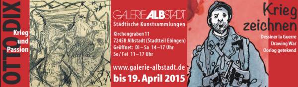 25. Januar bis 19. April 2015 OTTO DIX I Krieg und Passion Eröffnung: Sonntag, 25. Januar 2015, 15 Uhr im Rahmen der öffentlichen Sonntagsführung Im Gedenken an den Ausbruch des Großen Krieges vor 100 Jahren zeigt die Galerie Albstadt Zeichnungen, Gouachen und Radierungen von Otto Dix zum Thema Krieg. Der kostbare, nur für begrenzte Zeit öffentlich zugängliche Bestand gilt weltweit als eine der bedeutendsten Sammlungen mit Arbeiten auf Papier des Künstlers. Dazu zählen neben einem umfangreichen Konvolut von Zeichnungen, in denen Dix auf die bizarre ‚Physiognomie‘ der von Granattrichtern und Schützengräben gezeichneten Landschaft reagiert, auch das Kriegsnotizbuch von 1915-16 und die farbglühenden Gouachen aus den Jahren 1917 und 1918, darunter ‚Leuchtkugel‘ und ‚Abendsonne (Ypern)‘, die aus konservatorischen Gründen außerhalb des Museums nicht mehr gezeigt werden können. Nach einem Dada-Zwischenspiel wendet sich Otto Dix 1924, zehn Jahre nach Ausbruch des Großen Kriegs, im Rahmen der Kriegsthematik wieder dem Bild des Menschen zu: grauenhaft entstellt und zerstört durch die Maschinerie des Krieges. Dix‘ monumentales Radierwerk ‚Der Krieg‘ zählt zur Weltkunst in diesem Themen-kreis. In neuer, erweiterter Auswahl zeigt die Galerie Albstadt zahlreiche der im Vorfeld entstandenen Vorzeichnungen zur Kriegsmappe aus der Sammlung Walther Groz. Dix‘ Arbeit am Dresdner Kriegstriptychon 1929-32 ist in der Albstädter Sammlung durch zwei Vorzeichnungen dokumentiert. Nach 1933 erscheinen zunehmend Motive der Passion in Dix‘ Werk – Themen, mit denen er sich 1913/14 schon vor dem Großen Krieg befasst hatte. Noch 1945 zum Volkssturm eingezogen, stellt Dix nach dem Zweiten Weltkrieg, nach seiner Rückkehr aus Krieg und französischer Kriegsgefangenschaft, die Frage nach menschlichem Leid durch Krieg und Gewalt noch einmal neu. Seine Pastelle zur Passion aus den Jahren 1946-48 gehören mit zum Besten im Werk des späteren Dix. |